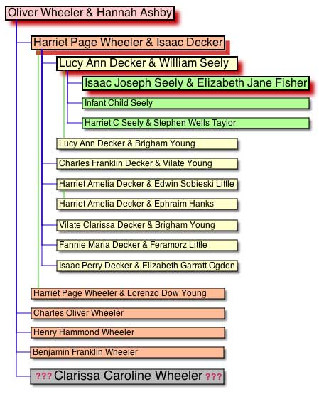 Until the spring of 2009, we’d wondered about our Aunt Caroline. We knew only that our Utah celebrity Grandma Harriet Page Wheeler Decker Young had mentioned three younger brothers and a sister to her friend, bishop, and biographer Orson F Whitney. We also knew that some of what Grandma Harriet had told Brother Whitney about her family wasn’t true. Might Clarissa Caroline Wheeler be just another example of Harriet’s fertile imagination? In other respects, we might excuse her factual lapses on the ground of ignorance, but we’re sure Grandma knew whether she really had a sister. |