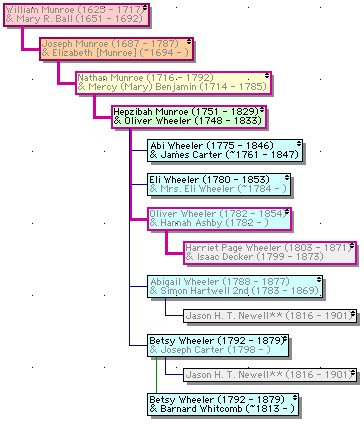 In the Hillsborough Center Cemetery, in Hillsborough Center, New Hampshire, lie a number of the descendants of William and 8GGM Mary Ball Munroe through William’s 12th child (of 14) Joseph (“Corporal Joe”) Munroe. I may not yet have found them all, but these two charts put into context the ones I’ve identified. In this chart, our direct line appears in VIOLET. |