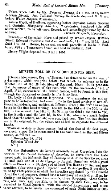 Note here that only the introductory text, attributed to the contributor, says anything about a “Minute Company.” The language of the transcribed document is appropriate to an ordinary militia muster roll. We know that Concord (unlike Lexington) did indeed organize a Minute Company, in response to the Provincial Congress’ directive in October, 1774; other documents record payment of the associated bounty to the participants. Somebody probably knows whether these were the Minute Men; I don’t. |