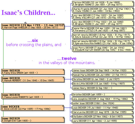 | Isaac had two distinct families: the first, monogamously, in the East, with our great-great-great-grandmother Harriet Page Wheeler, and the second, with five plural wives after he came to the Salt Lake Valley in 1850. |