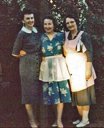 Margo into the Sisters’ Circle, and we snapped them in front of the bougainvillea at the east end of the porch. Richard may have taken the photo, or he may have been away at college or mission. Apologies for the dreadful lighting.