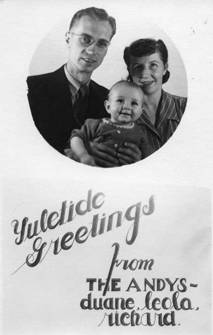 By the way, all subsequent cards spelled the name out in full, if they cited it at all: “Anderson.” we never heard anybody call Leola “Andy.” Duane was “Andy” mostly among his professional friends. Richard has been known to appeal to this card as justification for his own appropriation of the quasi-Scandinavian patronymic handle. |
