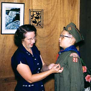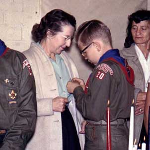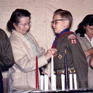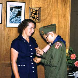 He’s solemn and proper, receiving at Leola’s hand a couple of advancements in rank in the Boy Scout program. He gets the first one (Tenderfoot, perhaps?) at home, in our living room. The second (we’re guessing Second Class: the Tenderfoot badge appears clearly on his bosom) came among his peers at a Court of Honor at the church building. This may have been his last Scout award: neither of us went very far in the program.