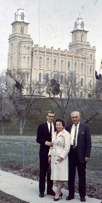 Preparing for his missionary departure, the folks went to the temple in Manti with Brent, where he received his endowment on April 17, 1965. Leola looks really lovely, between her two six-footers. Do you think the photographer intended to repeat the twin-tower theme from the background?