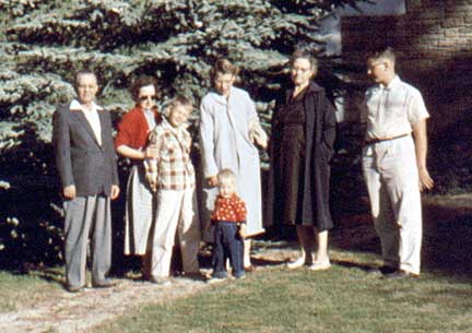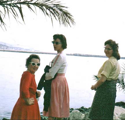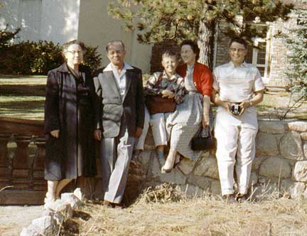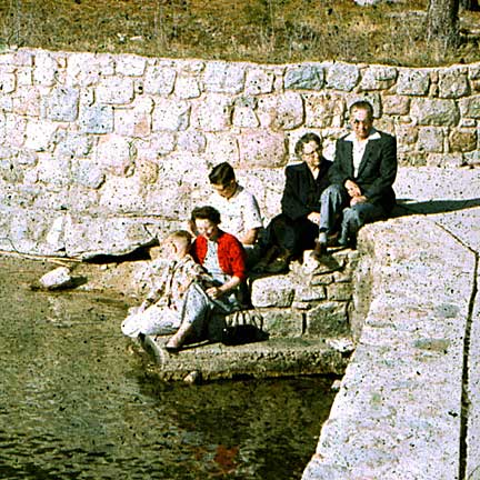 Another outing, this time perhaps to Lake Arrowhead in the San Bernardino mountains. Leola stands out in her red sweater. Duane was surely behind the camera for these slides.