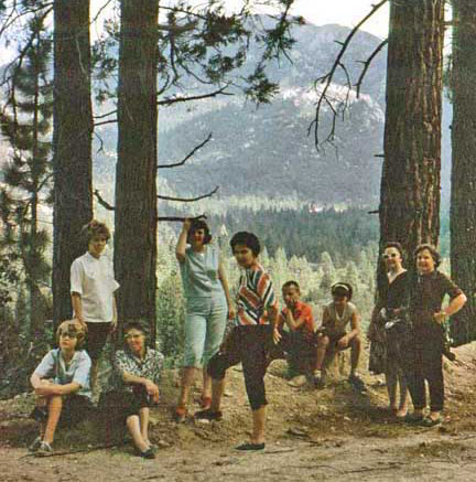 And in case you’re wondering what became of the third member of this adventuresome trio (triumulierate?), that’s Florence, hanging onto a dead branch just left of center, in the sylvan group below. At least some of the others are her kids. That may be Doug in the orange shirt. Myrle never married. Leola, by the way, was partial to the mountains and disliked the beach. We deliberately omit the few beach shots we have of her. We suspect she’s glad. For Duane, the preference went in the other direction. |
