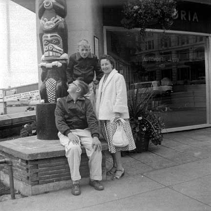 Outside the souvenir shop in Victoria, Brent mimics the totem pole, and Leola supervises.