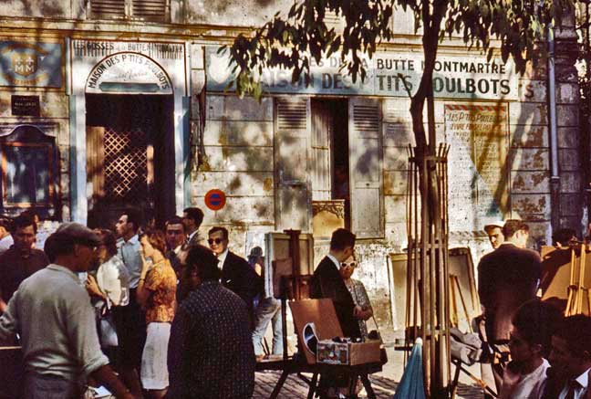 Paris! At last! Above: Leola on Montmartre, complete with sunglasses, absorbing the artists-and-models ambience, partly obscured by a missionary-looking person, possibly her son Elder Richard.