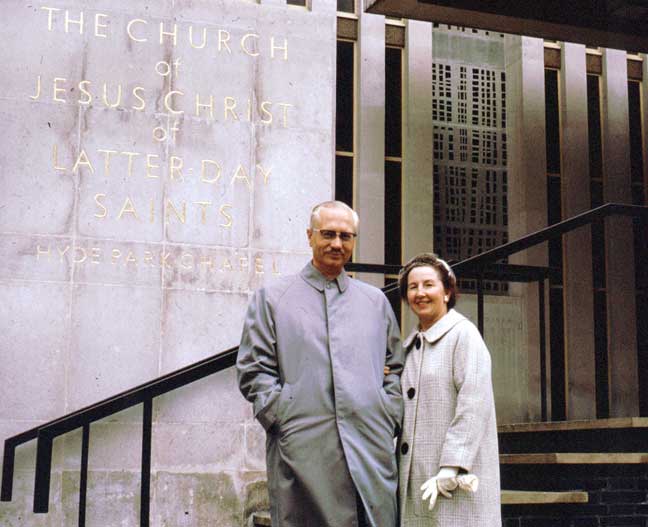 | While in London, they went to Church at Hyde Park, posing for this “Kilroy Was Here” shot. Cropped, it yields one of our best portraits of Duane and Leola. |