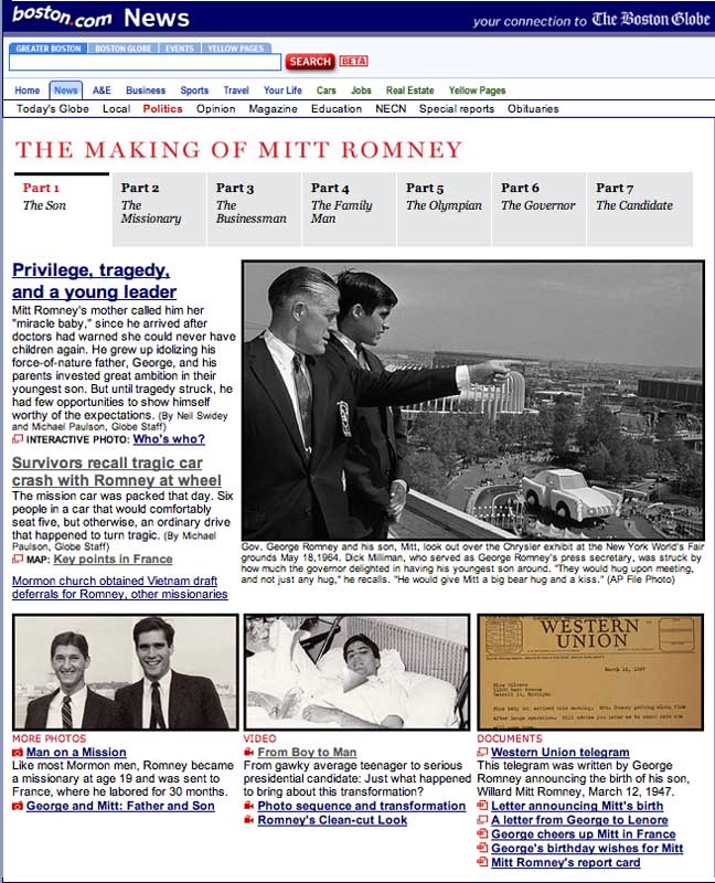 David Kirkpatrick of the New York Times, Michael Paulson of The Boston Globe, and Eli Saslow of the Washington Post all (independently) approached us to find out more about the accident. We entered upon these conversations rather gingerly, surmising that each reporter would have been overjoyed to be the first to uncover some dirt on Mitt. As we talked, however, each clearly gave up any muckraking intentions and came around to a much more sympathetic (and from our point of view, accurate) position. However that may be, each produced a very professional and sensitive essay for his newspaper, and we’re glad to have had a part in the process.