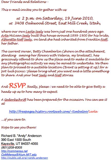 In response to this invitation, twenty-three of us gathered at Leola’s birthplace, beginning around two in the afternoon of her hundredth birthday.