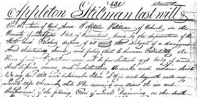 In the Name of God, Amen I Appleton Stillman of Cobrook in the County of Litchfield State of Connecticut, being by the disposition of the Holy and Richoes, disposing of all counts the subject of a dangerous And threatening disorder, and feeling that to human Probability, the Time of my Departure may not be far distant yet being of sound And disposing memory, and understanding, Do make and ordain this to Be my last Will and testament. Item I Give and bequeath unto my Loving wife Amanda, while She remains my Widow the use and Improvement, of the following Piece of Land beginning on the South… |