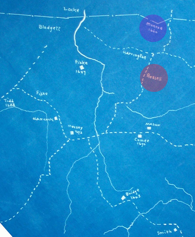 | The dashed lines on this map represent roads or paths, not (necessarily) property boundaries. The (sorta) east-west Woburn Road, wiggly and more or less diagonal here, lay between “Scotland” and the Russell homestead, as did the old road north (leftward) to Billerica and south to “The Rocks,” (Arlington Heights), which followed very roughly the course of present Lowell Street, Laconia Street, and the Middlesex Turnpike. |