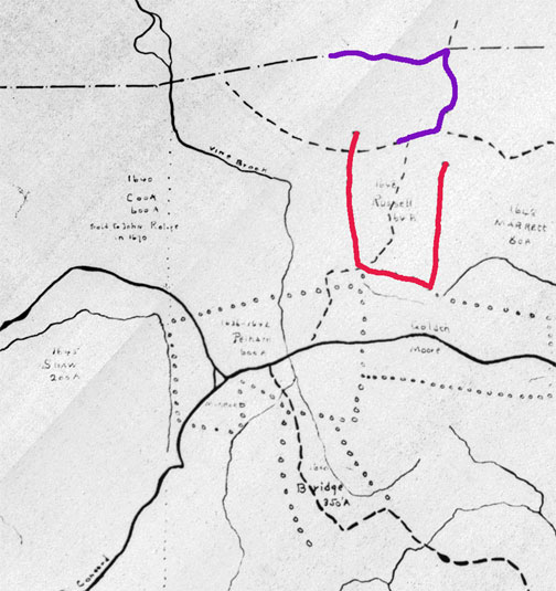 The Munroe boundary (in purple) is conjectural (until I turn up better evidence), but it’s pretty clear that “” stopped at the Woburn line and, probably, at Woburn Road, as I’ve shown. Just how far it extended toward the north (left), I’ve as yet seen no evidence. |