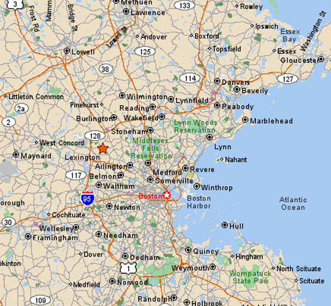 | The red star on the map shows Lexington’s location in present-day Greater Boston. The pages to follow discuss the town’s founding, our connections to early settlers, and our folks in the Old Burial Ground there. I’ve presented our connections to the famous Lexington-Concord Alarm of 1775, rather diffusely, both here and in the context of our pervasive roots in the Town of Carlisle. |