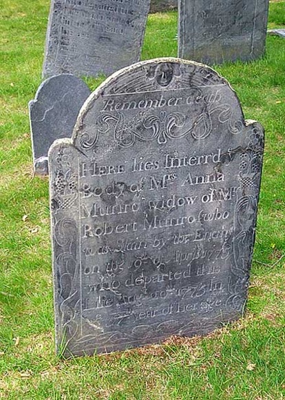 Remember death Here lies Interr'd ye Body of Mrs Anna Munro, widow of Mr Robert Munro (who was Slain by the Enemy on the 19th of April 1775) who departed this Life Aug 20th 1775 In ye 57th year of her age. |