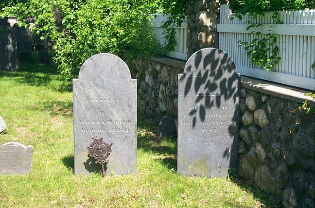 Ruth Munroe (1742-1839—our half second cousin, seven generations removed), daughter of Ensign Robert Munroe, married Lieutenant William Tidd (1736-1826) who was second in command on Lexington Green and was wounded there. The insignia by William’s stone denote his Revolutionary service. Their graves occupy the row just behind that of Ruth’s great-grandfather, William the Immigrant.