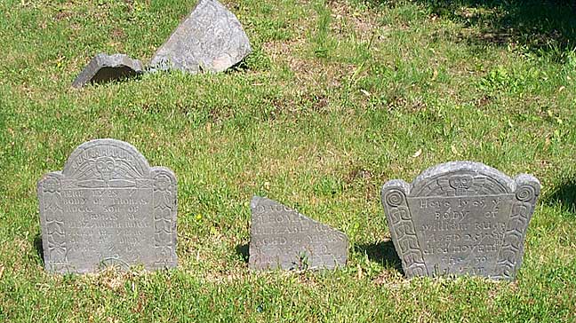 | Just to the left of the Tidd graves are small stones belonging to three of the eleven children of Thomas Rugg and our Aunt (8 greats) Elizabeth Munroe, third child of our eight-greats-grandparents William and Mary Ball Munroe. These three full first cousins (8 generations removed—left to right) Thomas Rugg (1690-1709), Tabitha Rugg (1708-1713), and William Rugg (1693-1717) all died unmarried and relatively young. |