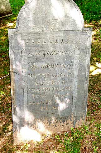 | Nathan (1762-1837) and Ruth Tidd Chandler (1767-1846) lie in the frontmost part of the Proprietors’ Cemetery. Ruth, our third cousin six generations removed, was a daughter of Lieutenant William and Ruth Munroe Tidd. |