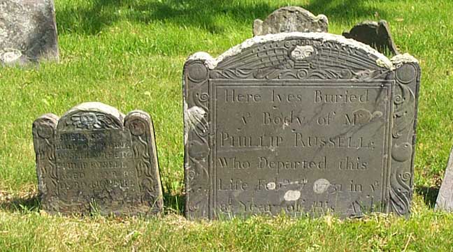 The Russell branch of our family is also well represented in the Lexington Burial Ground. These handsome stones mark the resting place of our Uncle (ten greats) Philip Russell (1650-1731) and his first wife Joanna Cutler (1660-1703). Both family names are still prominent in the area, particularly in the Arlington where our kids grew up.