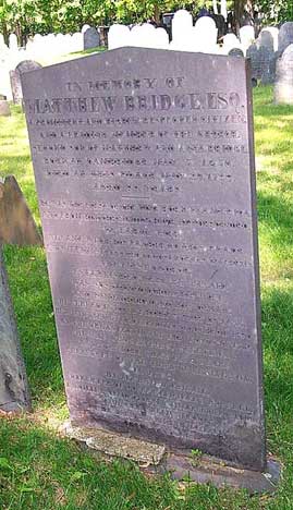 IN MEMORY OF MATTHEW BRIDGE, ESQ. A PROMINENT AND HIGHLY RESPECTED CITIZEN, AND A LEADING MEMBER OF THE CHURCH. SECOND SON OF MATTHEW AND ANNA BRIDGE. BORN AT CAMBRIDGE MAY 5, 1650. DIED AT THIS PLACE MAY 29, 1738, AGED 58 YEARS. — HE WAS THE FIRST OF THE LINE BORN IN AMERICA, AND FROM HIM THE FAMILY HAVE ALL DESCENDED. IN EARLY LIFE, HE CAME WITH HIS FATHER TO THIS PLACE, AND WITH HIM STRUGGLED TO ADVANCE ITS INTERESTS. THE FIRST CHURCH, ESTABLISHED HERE BY HIS AID, WAS SUSTAINED DURING HIS LIFE, AND REMEMBERED AT HIS DEATH. HE SERVED IN KING PHILIP’S WAR IN 1675; HE JOINED THE ILL-FATED EXPEDITION TO QUEBEC IN 1690. AT THE ORGANIZATION OF THE TOWN IN 1712, HE WAS CHOSEN FIRST SELECTMAN, AND FOR MORE THAN FIVE YEARS TREASURER OF THE TOWN OF LEXINGTON. IN 1687, HE MARRIED ABIGAIL, DAUGHTER OF JOSEPH AND MARY RUSSELL A WOMAN ESTEEMED FOR HER AMIABLE DISPOSITION AND CHRISTIAN VIRTUES. SHE DIED DECEMBER 14, 1722, AGED 55 YEARS. |