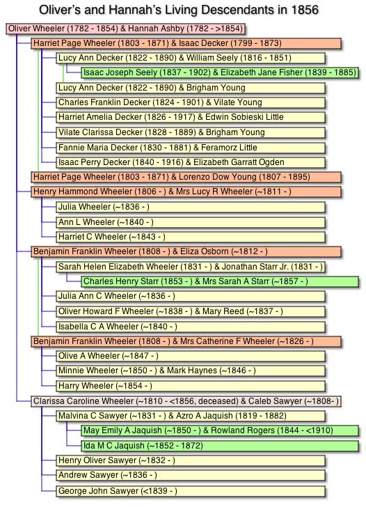 Note, please, that she still thought of Grandma Harriet, her oldest daughter, as Mrs Isaac Decker, even though Harriet and Lorenzo Dow Young had been a prominent couple in Utah Territory for a dozen years. It’s sad that she didn’t mention any of her six Decker grandkids, five of whom she’d known before their 1836 departure from Freedom. She would also have known Benjamin’s first two girls (Sarah Helen Elizabeth and Julia Ann C), who seem to have shared the Elton roof with her and Oliver around 1835. |