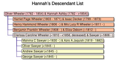| So here’s the list she gave them. I presume it reflects the best of her knowledge. It also reflects the heartbreaking state of non-communication in the Wheeler family. Had Grandma Hannah been in touch with her scattered family, she would surely have “cited” a score of additional grandchildren and great-grandchildren to come to the probate hearing. |