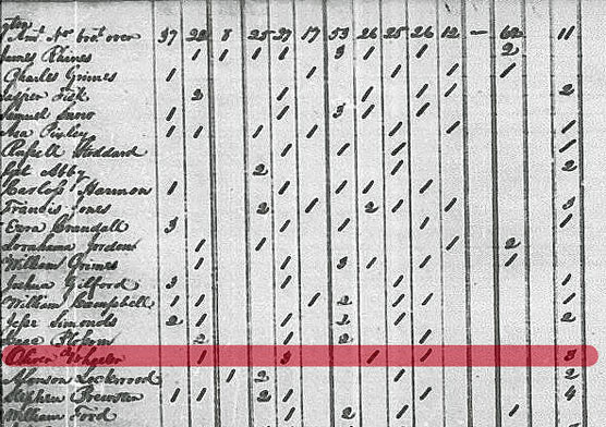 Oliver Wheeler’s household in Farmington. Left to right, the five entries report six inhabitants: