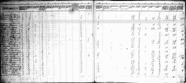 The relevant entries are the fourth and fifth lines on this double page, emphasized but illegible at this scale. We do observe, however, a contrast between our family’s entries and those of the bulk of their neighbors. By and large, the Wheelers lived in a community of farms, each with livestock enumerated in the columns toward the right. As we will argue on the next page, Oliver’s entry looks more like that of the cabinet-making craftsman that later censuses report.