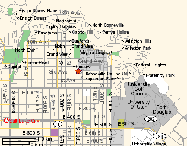 I’ve found, thus far, 16 of our very interesting near kin buried in the Salt Lake City Cemetery. They’re all either direct ancestors of my Mammy, Leola Seely Anderson, or others closely associated with those ancestors (spouses or siblings). I could have listed others similarly qualified and lying nearby, but this will get you to the right neighborhoods. Should you decide that you wish to visit them, these pages should help you find them without spending as much time hunting as I did. And the links in the hypertext version of this guide will take you to a lot of pictures and stories about these relatives of ours. This first map shows the location of the cemetery in Salt Lake City. The red star marks the main entrance. |