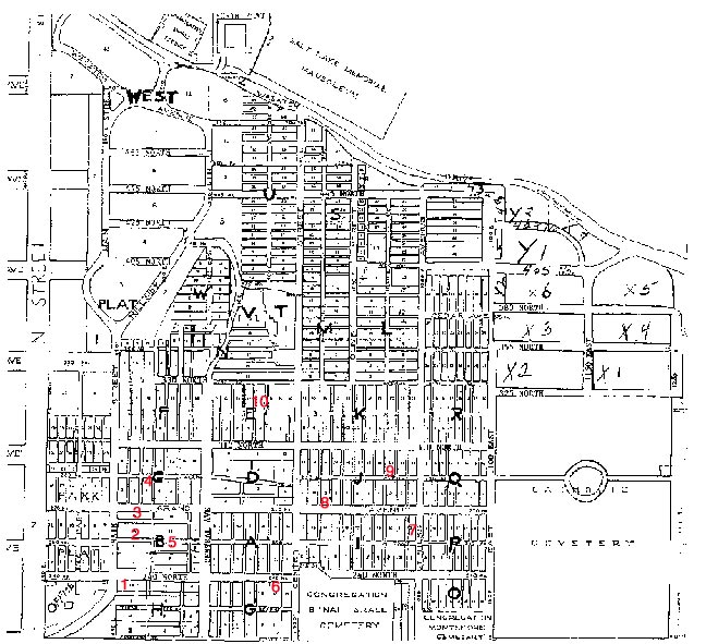| Here, if hard to read, are the block and plot numbers in the whole cemetery, with our ten stops numbered in red. The next map focuses on the area which particularly interests us. Even enlarged, the underlying map’s fuzzy, but it should be good enough to follow around. The streets are pretty well marked (don’t confuse “Central Avenue” with nearby “Center”), and if you look closely you’ll see little square stone (or concrete) plot labels, usually flush to the ground but sometimes inscribed on curbs. |