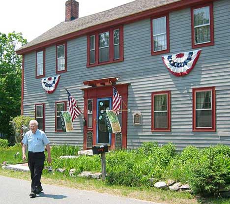 Caught Willard in 2007, walking out of Sandisfield’s only lodging-house, the New Boston Inn, which dates from 1737. It’s neither new nor particularly Boston, but quiet and charming. These days it’s listed as a bed-and-breakfast. I stayed there (in Chamber #1, at the top of the stairs — the two upper windows on the left) on my visits in 2007 and 2009. Kinda expensive for our budget, but very pleasant. |