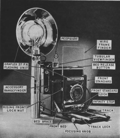 That couch — it figures in several shots here — stirs vague memories, believe it or not. Mostly tactile and olfactory. I don’t think it went with us to California, five years later. This classic Anniversary Speed Graphic camera looks very much like what I remember of Pappy’s treasured real-newspaper-photographer’s-big-black machine. |