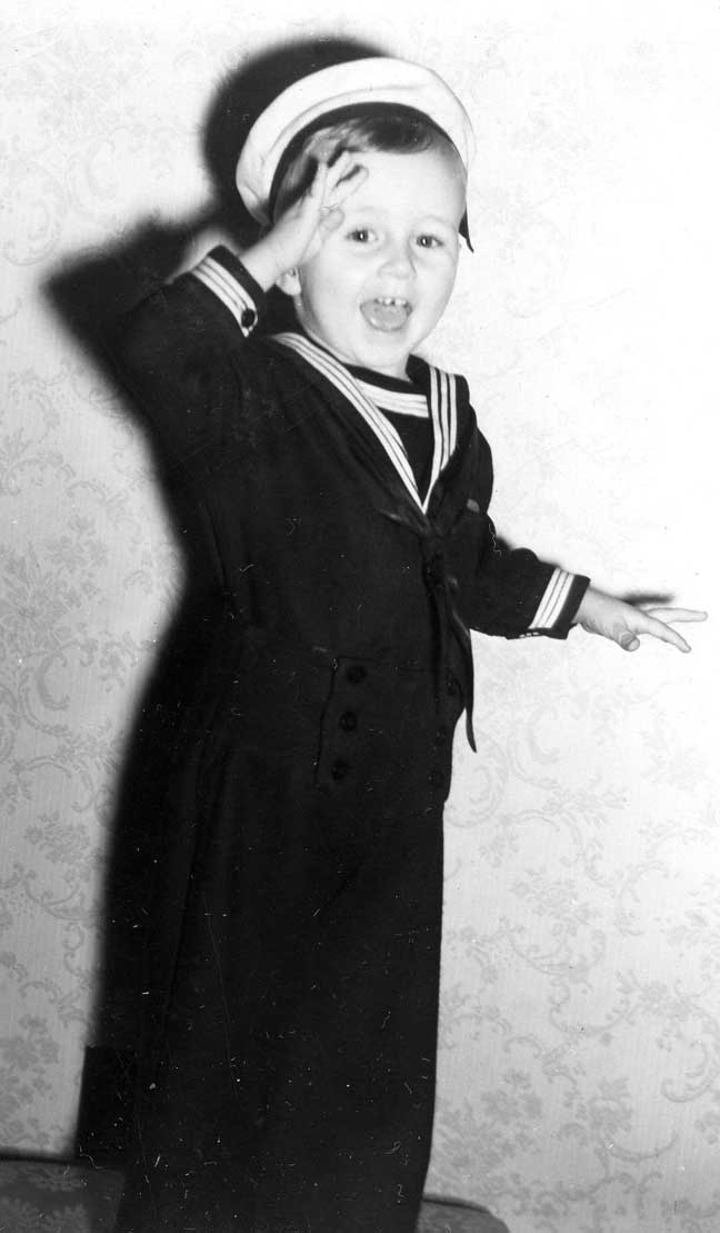 With the war on, and with my uncle Clair (Pappy’s brother) in the Merchant Marine, I frequently sported this sailor suit. The bear was a good buddy. I seem to remember a 1943 Christmas card featuring some version of this saluting photo, but I can’t just now lay my hands on a copy.