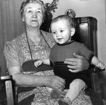This is the only photo I’ve seen of the two of us. I do recall, or think I recall, hearing her referred to as “Grandma Poulsen.” I look pretty comfortable on her lap. |