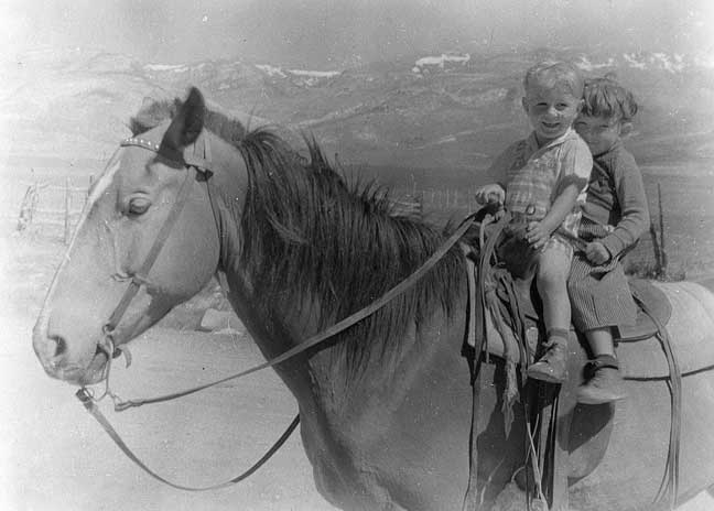 My cousin K.G. (Kenneth Goodliffe Carter, Jr) sits “Sailor”’s saddle more easily than I, at the Carter ranch at Park Valley, Utah1. He’s also kinda squunched down, so that you can’t really tell he’s my senior by a couple of years. Park Valley lies north of the Great Salt Lake, ninety miles (largely on dirt roads, in those days) northwest of Brigham City, but still in Box Elder County. The Idaho line is on the other side of the mountain range to the north.