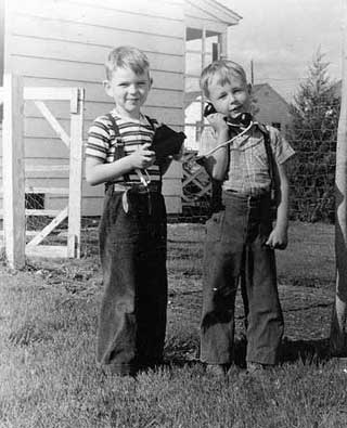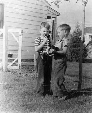 During the war, at about this time, both Pappy and Mammy were working at the Ogden Arsenal (shipping munitions to and from the Watertown Arsenal, as they liked to tell us, later on). So I got what we’d now call family day-care from the Poulter family. Their Vern and I took turns talking on a toy telephone, out in their yard. Vern was older than I; the interval of four years sticks in my slippery memory. He doesn’t look that old here, but maybe I was just cosmetically precocious.