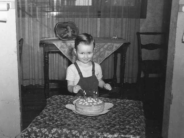 This image deserves its own page: Pappy put it together with real artistry, you’ll agree. Not only am I almost unbearably cute on my fourth birthday, but it’s just three and a half years, to the day, since he created the famous nude study on the table behind me. You may discern that Mammy didn’t really entrust a lighted match to my juvenile fingers: all four flames belong to the candles.