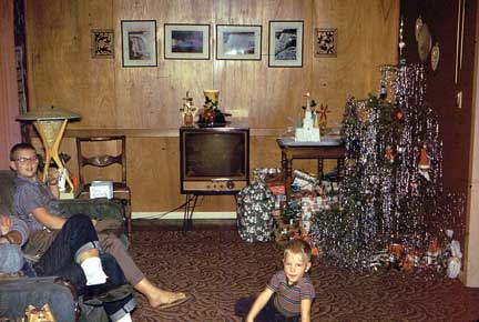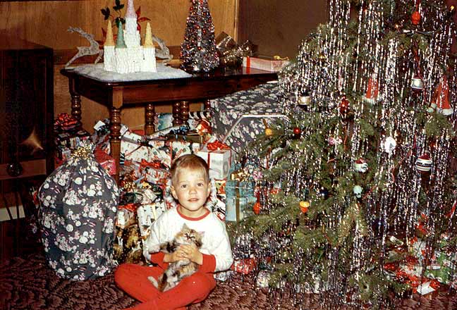 We had the tree in the northeast corner of the living room, with a marshmallow castle on the dining table. The icicles bear clear marks of my tender ministrations. |