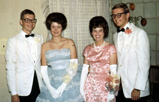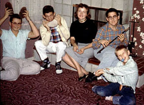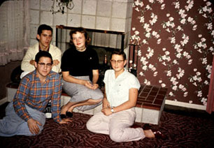 | Left pic: Clockwise from lower left, Mel Kinder, Del Riddle, Annie Richards, and Obediently (if apparently drowsily) Yours. Mel was president of Pacific High School’s Key Club (apprentice Kiwanis) when I joined in 1955 as a sophomore. He’s immortalized (demoralized?) among cognoscenti of the time and place as “Where’s the Bell?” Mel. Right pic: Same crowd (plus ten-year-old Brent), same spot, another mood. Annie and Del lived with us for various family reasons, late in their respective high school careers. |