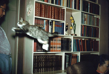 When Shirley Bogh remodelled the house, he built this handsome set of shelves into the northern wall of the front section of the L-shaped room, opposite Pappy’s “declining chair” and behind Mammy’s Studying Chair.1 I’d have put this with the other material on our cats, except that it’s also the best shot we have of the bookcase. And of an interpersonal/interspecies treasure of this era. My best friend and treasured furry companion, Pinky the Wuss, appears here in front of the bookcase, greeting me on my return from school, leaping from the back of Mammy’s Studying Chair to land kerthump upon my ample bosom and lick the salt off my sweaty neck. Mammy remains, of course, unfazed. |