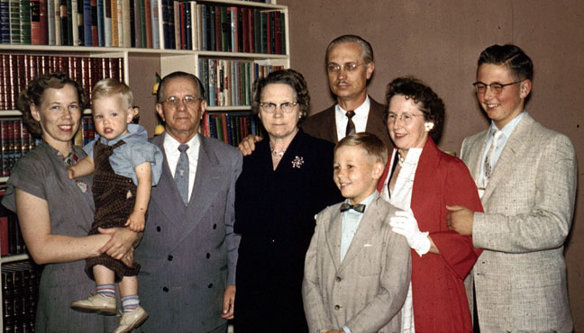 Must confess to a bit of uncertainty as to the date of this jewel. The clothes suggest strongly that this shot and the ones on the next page were all taken on the same Sunday (that’s when we’d be dressed like that). The group includes both a very young Scott (born 1954) and Del, who was with us from 1956-58). These forces did come together when I finished high school in 1958, but both Scott and I look too young for that. Did they all come to Berdoo in 1956 or 1957? Maybe for Christmas? Somebody please help. Also, please note in passing that light-gray tweed sport jacket I’m wearing. It’s the very one that Valerie would cut down to an overcoat for toddler Ricky, as later photos attest. |