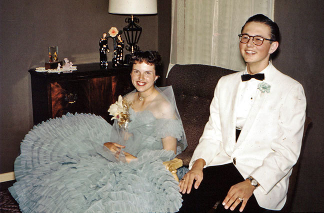 Different furniture once again, by this time. Whatever the shindig we were headed to, Linda was once again my date for the evening, and the gorgeous Valerie Jorgenson was Don Ellsworth’s. Only fitting, of course, because it had only been a year or so since the love of my life (the said Valerie) had moved to town and turned up at Third Ward Sunday School on Don’s (my best friend’s) arm. All our paths have since taken directions that weren’t at all obvious then. If you can stand it, I’ve put further records of my rather undistinguished dress-up social life here, under the general rubric of of human sociability. |