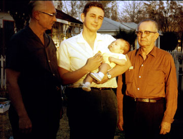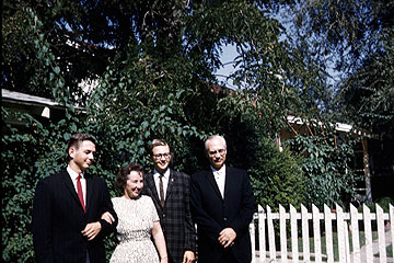 Same spot, different group of four. This time, we’re four patriarchal generations of Andersons. In late 1965 or very early 1966, left to right: Pappy (H. Duane Anderson), me (Richard Bryan Anderson, Senior), Rick (Richard Bryan Anderson, Junior), and Grandpa (Francis Emmanuel Anderson). |