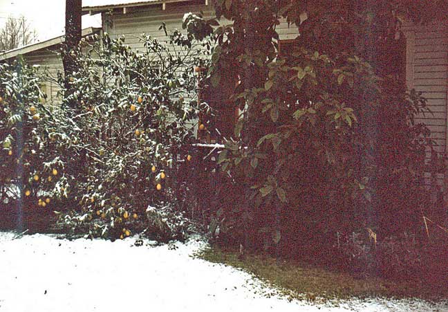 Here’s the northeast corner of the yard, showing the lemon and (back-yard) avocado trees on the day of the big snow. Mrs Schreiber’s quiet domicile in the background. |