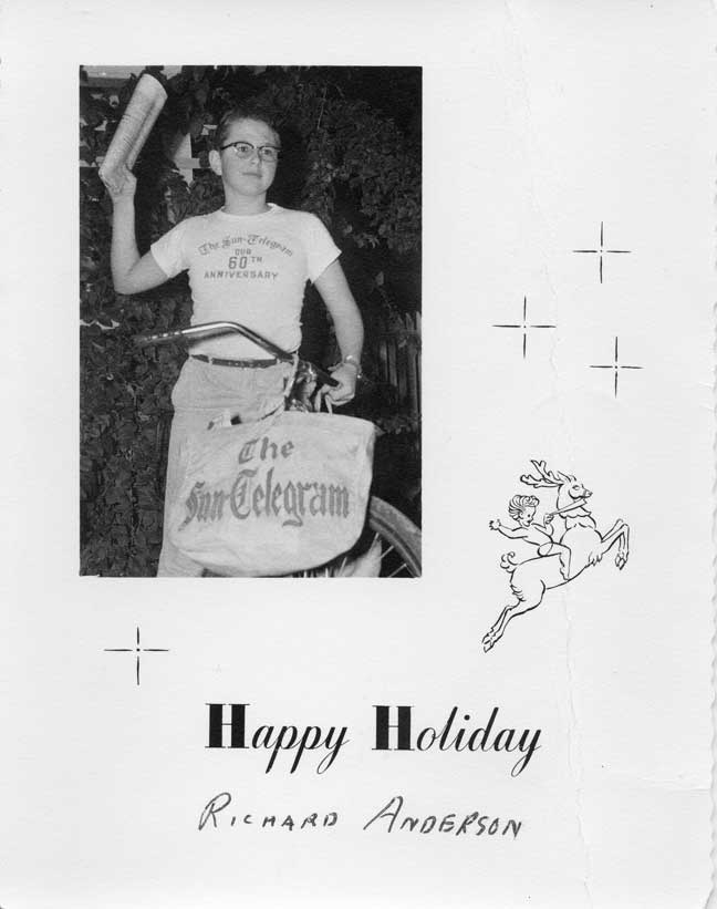 For Christmas 1953, Pappy kindly added to his annual family photographic routine a card for my customers. Yes, that year I delivered morning newpapers for the San Bernardino Sun-Telegram. This typically-professional Pappy-style card landed me a tidy pile of cash gifts, that year.