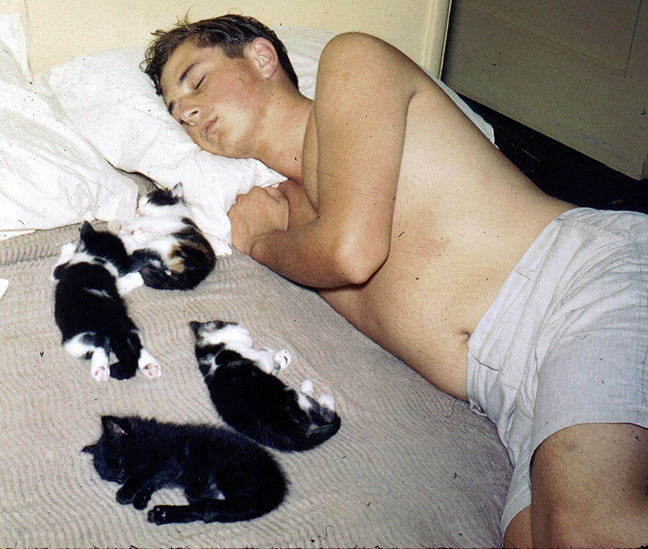 San Bernardino. Behold a group siesta, with cute little furry participants and one sweaty high-schooler of our acquaintance. And need we be reminded that this was long before residential air-conditioning became common, at least at our end of the economic spectrum?