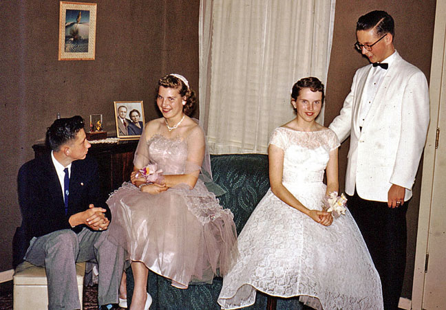 | And so here’s another shot of the double-date group already featured here. Must’ve been a major event, what with me in a rented dinner jacket and both adorable young ladies with orchid corsages. Again, that’s Linda Meyer at my side and Valerie Jorgenson (my future permanent partner) at Don Ellsworth’s. All of us arrayed in Pappys’ Corner of the 16th Street living room. |