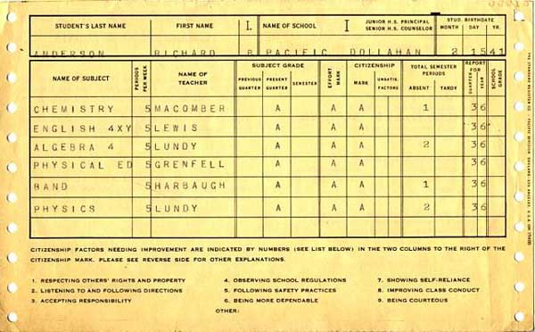 While Ruth Lewis, Harry Harbaugh, and John Grenfell provided continuity in my esteemed faculty team, two important new names appear on this year’s reports: Bob Macomber initiated me into the mysteries of chemistry and included me in LOLA, the most enjoyable Loyal Order of Lab Assistants. Meanwhile, Don Lundy taught me “Algebra 4” and my eventual very stylish college major, physics. Their courses formed the core of my high-school “math-science” concentration. It wasn’t until the next year, in Massachusetts, that I realized Mr Lundy had introduced us to calculus (in Algebra 4) and to an unusually advanced version of high-school physics, with the result that I entered MIT with a notable advantage over most other freshmen there. I was already familiar with material in freshman calculus and physics that most of my classmates hadn’t yet encountered. Greatly facilitated a straight-A performance in my first couple of years of college. |