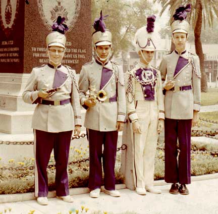 | Here I am in uniform, with fellow bandsmen Ernie Martinez, Del Riddle, and Paul Chapin. Not sure where: some band outing or other. |